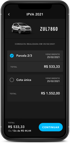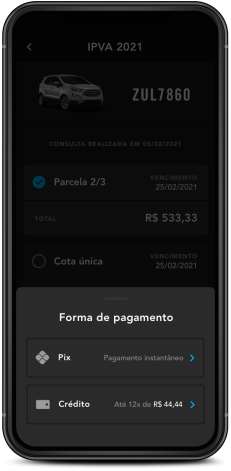Consulte o valor e pague o IPVA de veículos registrados em SP com o app Zul+ utilizando Pix ou em até 12x no cartão.